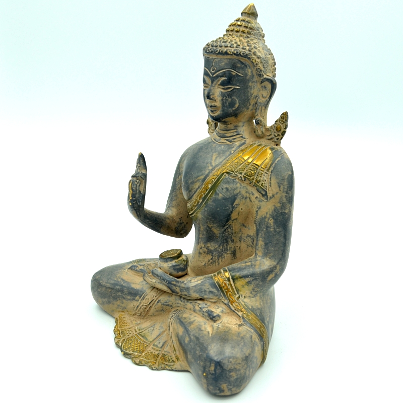 Statuette de Bouddha dans le geste de l’enseignement (vitarka mudra) et tenant son bol à offrandes dans sa main gauche.