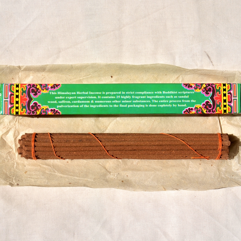 Nous avons sélectionné cet encens tibétain de haute qualité au Népal. Il est préparé par une petite entreprise artisanale dans le quartier qui jouxte le grand stupa de Swayambunath à Katmandou. Cet encens contient 25 ingrédients aromatiques comme le bois de santal, le safran, la cardamome et d’autres extraits végétaux. Il a été entièrement élaboré à la main en accord avec des textes bouddhistes anciens.