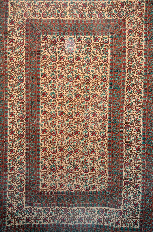 Tenture imprimée au bloc 150/220 cm provenant d’un atelier de la région de Jaipur au Rajasthan. Couleurs et motifs sont traditionnel du village de Bagru.