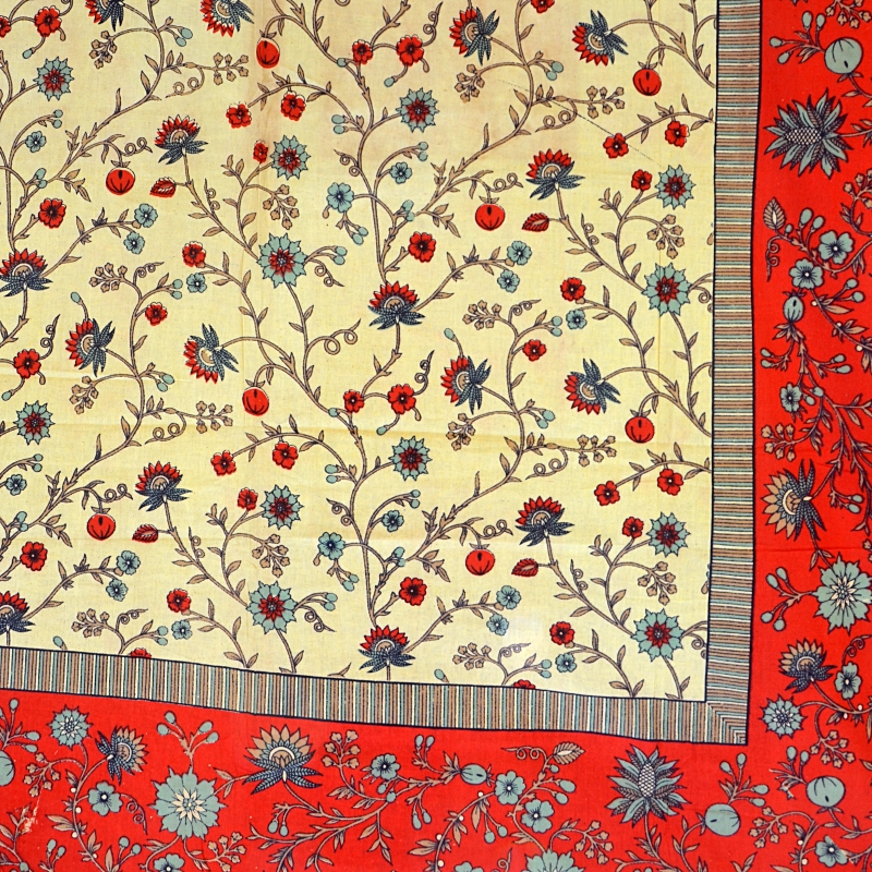 Tenture indienne en coton fabriquée artisanalement près de Jaipur dans l’état du Rajasthan en Inde. Cette cotonnade peut être utilisée sur un canapé ou en jeté de lit, en décoration murale ou bien comme nappe. Ce motif convient particulièrement bien pour habiller une table rectangulaire.